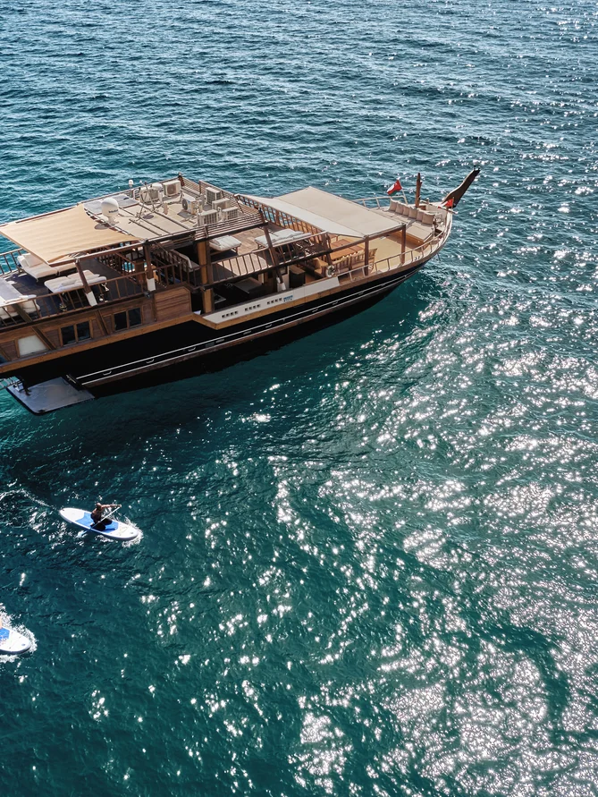 Over a three-day, two-night odyssey, the Dhabab explores the coast of Musandam, where the Hajar Mountains tower over quaint fishing villages, stopping to rest along the way in secluded bays bursting with marine life. Time can be spent touring the fjords in kayaks (single or twin), snorkeling, hand-line fishing, perfecting your tubing skills, beach combing, swimming or doing absolutely nothing. There are also options to take a cooking class with the chef, book a bespoke dive to witness colorful corals, bring a spa therapist on board, and watch an onboard movie under the stars.