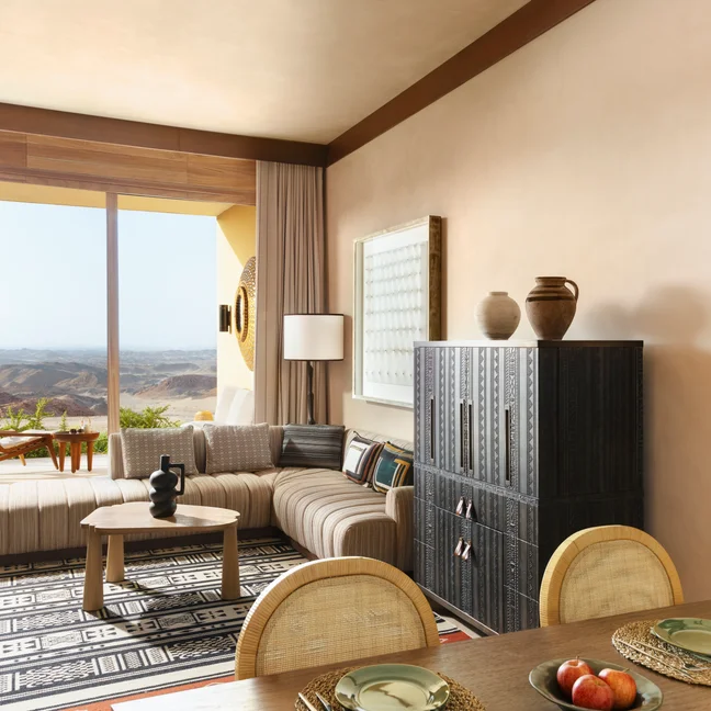 Consistent with our sustainability standards, our guest rooms boast spectacular desert vistas and unique cultural charms. These new spaces are designed to connect inner privacy and seclusion with the allure of desert adventures outside. Surrounding our main Oasis complex is a collection of 36 guest rooms and suites, and a further 40 pool villas are dotted in strategic locations, with interiors reflecting the tones and textures of the sandy dunes and soft furnishings drawing from the rich colors and patterns of traditional Bedouin tribal dress.