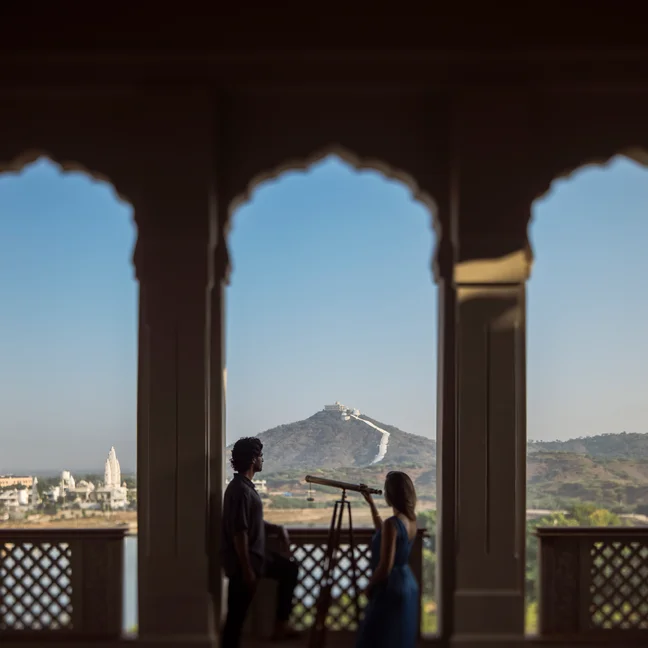 Este espacio único ofrece una impresionante vista panorámica del Templo Chauth ka Barwara. Con ventilación cruzada en ambos lados, es ideal tanto para eventos diurnos como para celebraciones nocturnas, capturando la esencia de la serenidad y el encanto cultural. Durante el día, la galería es perfecta para reuniones íntimas de hasta 30 invitados. Al atardecer, se transforma en un lugar mágico para cócteles antes de la cena, donde la belleza iluminada del templo crea el ambiente perfecto para un evento encantador.