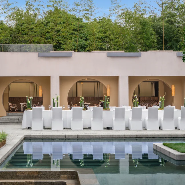 Avec son décor serein de plantes verdoyantes et ses eaux bleues paisibles, le Poolside offre un cadre élégant pour une réception raffinée ou une cérémonie intime. À la tombée de la nuit, l'espace se transforme en un havre de paix romantique, illuminé par une douce lumière et entouré par la beauté de la nature.