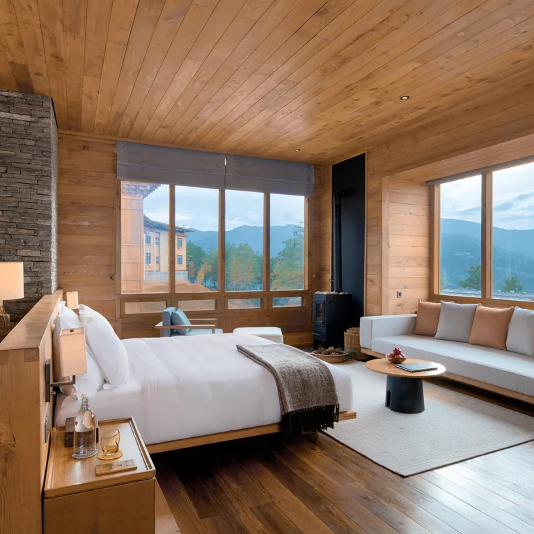 不丹六善酒店擁有 82 間寬敞的別墅和套房,套房的室內面積為 645 平方英尺,三臥室別墅的室內面積高達 3,681 平方英尺。